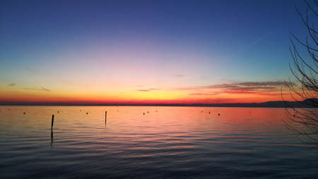 Sunset at Garda lake, Italy. Italian landscape. Pier in perspective
