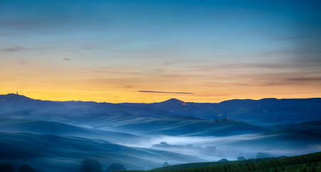 Dawn in a misty valley in the hills in Tuscany, Italy