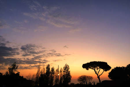 Sunset landscape silhouettes of trees in front of a colorful orange and purple sunset