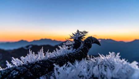A close-up view of intricate ice crystals catching the first golden rays of a winter sunrise.