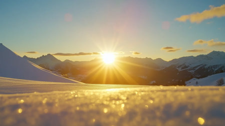 Beautiful winter sunrise over snow-covered mountains with golden rays illuminating the landscape