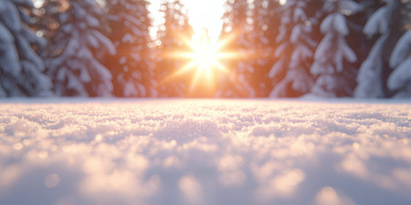 A winter sunrise over snow covered landscape, sparkling snowflakes