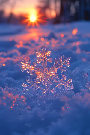 Sparkling Snowflake in Snowy Sunset Winter Wonderland Scene