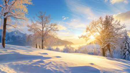 Breathtaking winter sunrise illuminates a snowcovered valley with golden light, casting long shadows and creating a serene landscape