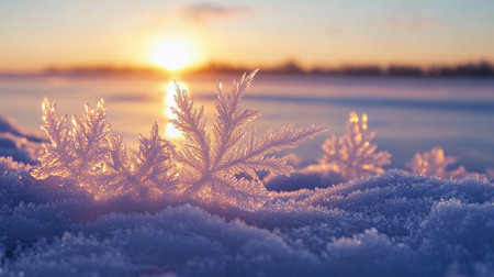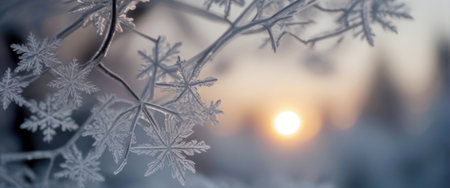 Frosty snowflakes glisten in the dawn light, forming an enchanting winter view filled with intricate crystal patterns and serene colors.