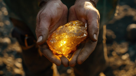 a miner proudly holding a gleaming gold nugget, with the focus sharply on the precious gemstone, illustrating the rewards of mineral exploration and discovery