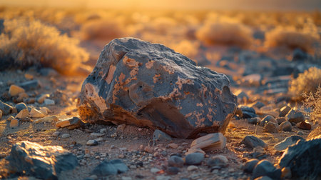 Rock on sandy surface with warm sunlight casting shadows in low angle close up view creating peaceful natural scene