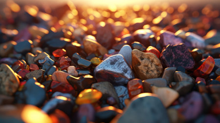 A serene scene of smooth pebbles on a beach during sunset, with warm light reflecting off the stones.