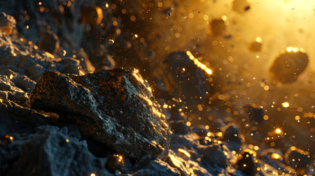 rocks of various colors, including dark crimson and light amber, are scattered on a rocky ground. rendered in cinema4d, the image showcases soft-focused realism and polished craftsmanship. sunrays illuminate the scene, adding a touch of shimmering metallics to the dark orange and sky-blue hues. ai generated