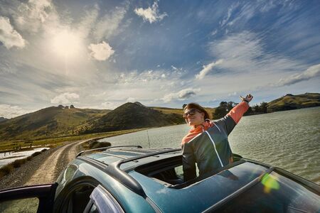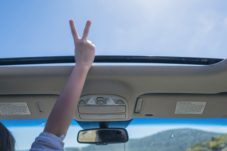 girl driver traveling by car and holds her hand out from open hatch of a vehicle. Travel lifestyle concept