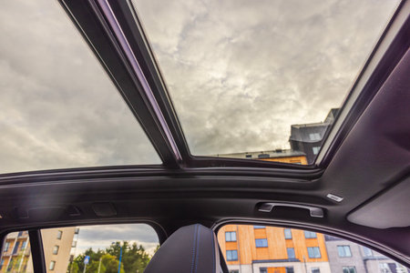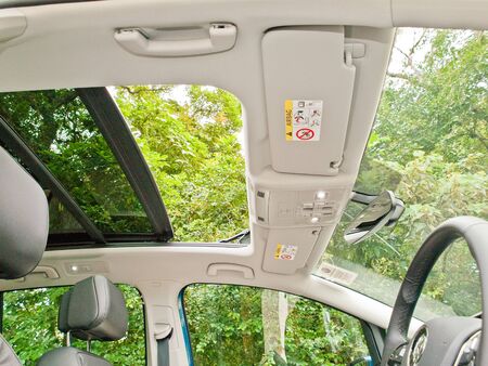 View of the ceiling of the car with a transparent glass hatch for airing, opening so that you can see the sky and clouds in the gray cabin of the vehicle. Sunroof on beige roof.