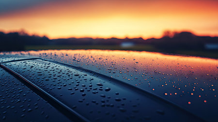 Moody sunset lighting over a carbon fiber spoiler wing, droplets of water beading on the surface of a freshly washed car trunk