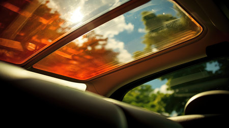 Experience breathtaking views from a car sunroof, with tall green trees swaying under a clear blue skyideal for adventure seekers and nature lovers seeking unique outdoor experiences