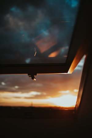 A vertical shot of a half-opened window allowing light from a sunset to creep in