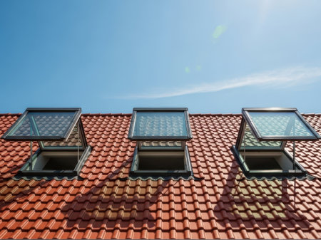 This image features four open roof windows installed on a red tiled roof, set against a clear blue sky with a few wispy clouds. The roof windows are open, allowing natural light and ventilation into the building. The image is presented on a clean white background, emphasizing the architectural details.