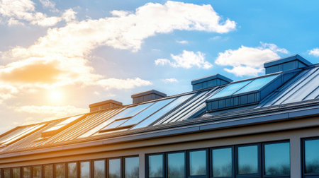 A modern building featuring sleek skylights showcases a stunning sunset against a backdrop of fluffy clouds, creating a serene urban atmosphere.