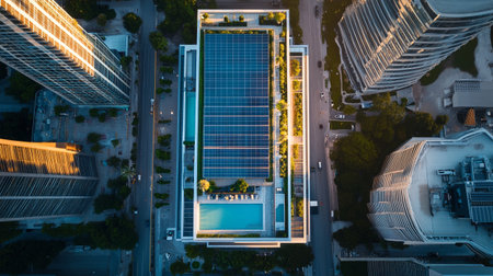 Green roofs with solar integration. Rooftop garden with integrated solar panels. Concept Sustainability, green energy, urban gardening, renewable resources