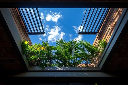 Architectural design meets natural elements, showcasing a skylight framing vibrant green plants against a bright blue sky. metal structures surround the skylight, adding a modern touch to the scenic view, the blend of nature and architecture. Generative AI