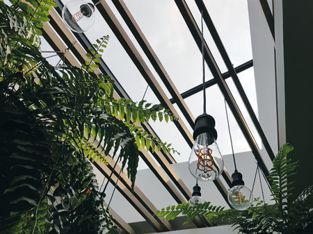 Low Angle View of Hanging Light Bulbs Against Open Roof Design
