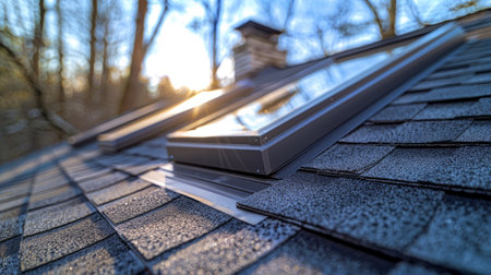 Skylight on Weathered Shingle Roof with Vent Pipes in Daylight