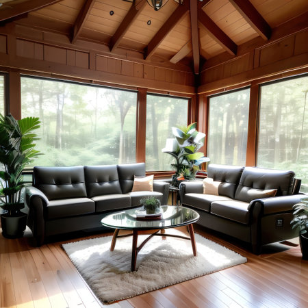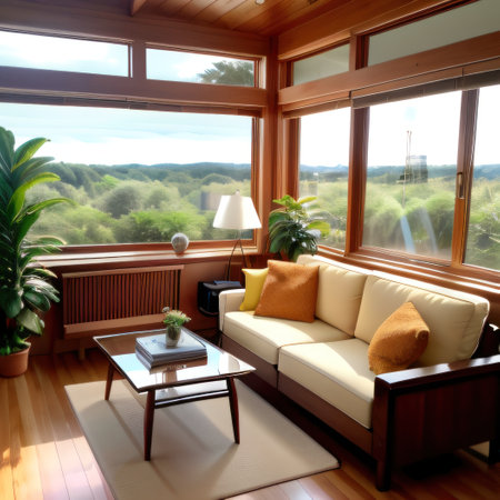 A bright and inviting modern living area featuring large windows that showcase lush greenery. This cozy space includes stylish furniture, vibrant decor, and a relaxing atmosphere ideal for unwinding or enjoying a serene view of nature.