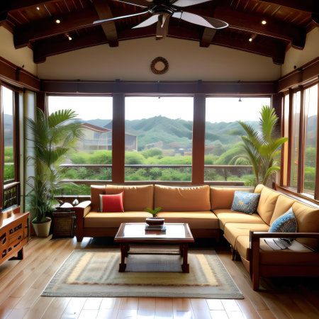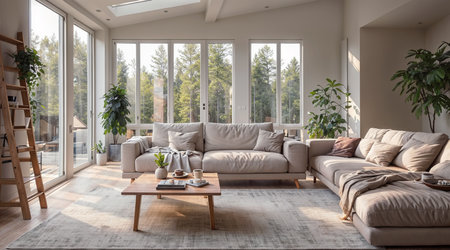 bright and sunny living room with cozy sofa, round wooden table with flowers, view of green landscape through large windows.
