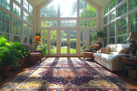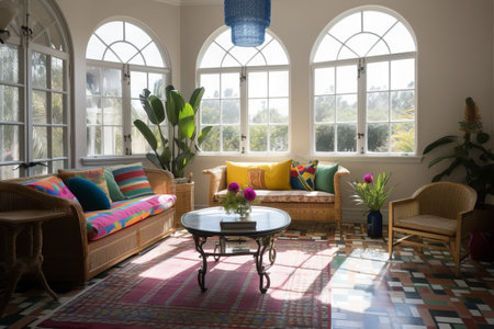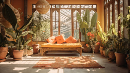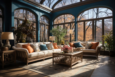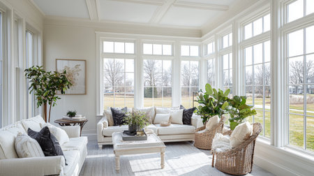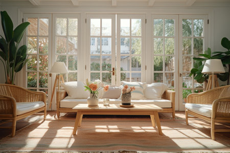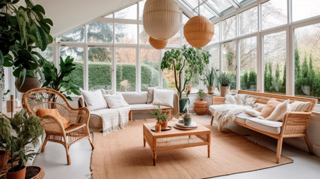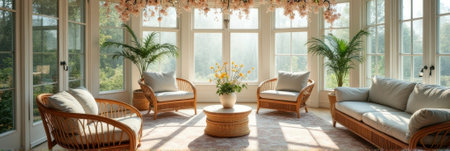 Bright and airy sunroom with wicker furniture and indoor plants. Generative AI technology