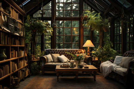Cozy interior with a warm lantern, wooden table, and lush greenery filtering soft sunlight. Perfect for inspiring peaceful moments and relaxation. Generated A.I.