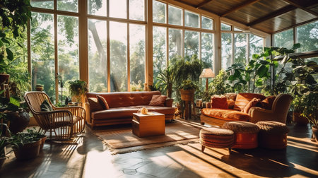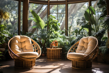 Sunlit conservatory with rattan chairs and lush greenery in tranquil space. That the image is generated using AI.