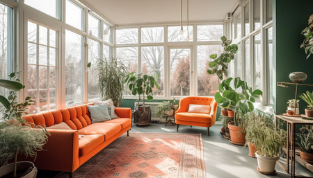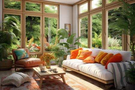 Sunlit living room filled with vibrant plants and cozy furniture in tropical style, background, AI Generated