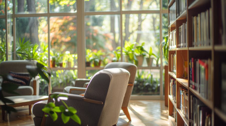 The peaceful reading area with comfortable armchairs and natural light streaming in from large windows