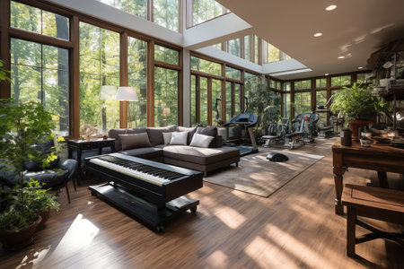 Interior of a modern greenhouse with plants and furniture, sunny day