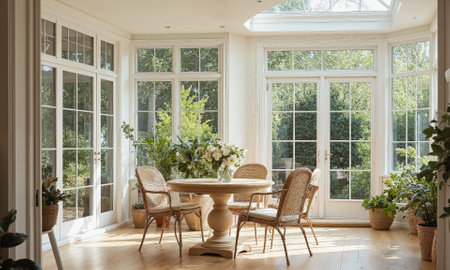 Elegant sunlit conservatory with wicker chairs and lush greenery. That the image is generated using AI.