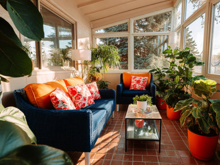 A beautifully designed sunroom filled with natural light, cozy furniture, and lush plants, creating a tranquil indoor space perfect for relaxation and comfort.