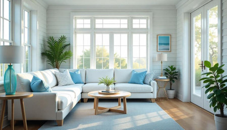 Cozy cottage living room with jute rug, rattan chair, and wicker pendant lamp. Warm sunlight pours through huge ocean-view windows. Nautical-themed decor completes the vibe.