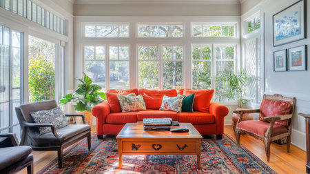 Bright and inviting living room featuring a vibrant orange sofa, abundant natural light, and stylish decor elements, perfect for relaxation and family gatherings.