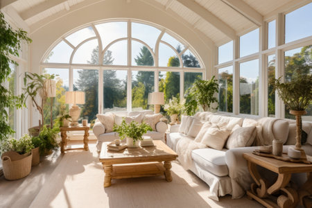Sunlit conservatory with cozy seating and flower arrangements. That the image is generated using AI.