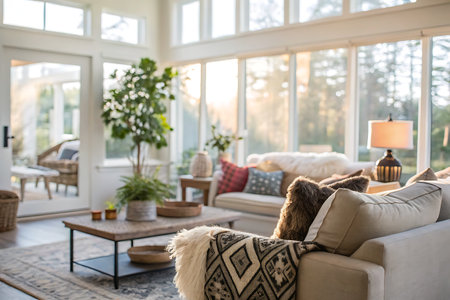 Morning sun rays through large windows in living room with spring decor inspiration ideas