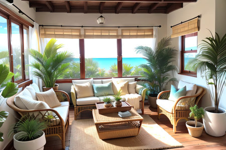 Bright and airy sunroom with wicker furniture and indoor plants. Generative AI technology