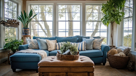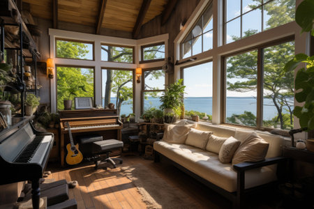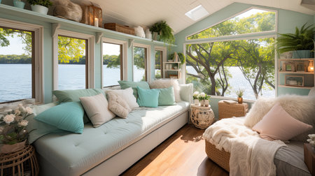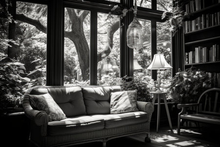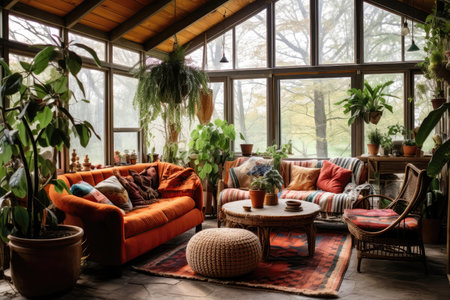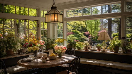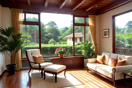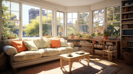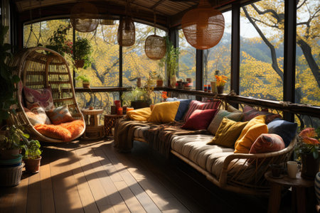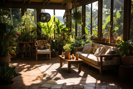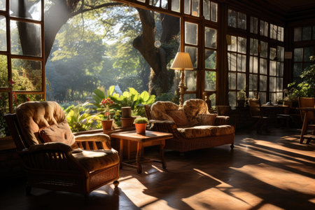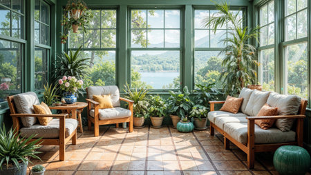 Sunroom A room with large windows or glass walls. AI generated illustration