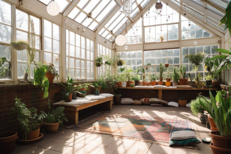 a greenhouselike space with natural light and plants, for meditation or prayer, created with generative ai