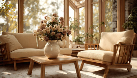 An inviting indoor scene showcases a vase of flowers on a wooden table, with comfortable furniture bathed in natural light. The composition features a neutral color palette with hints of sunlight illuminating the setting. This image is suitable for various commercial uses, including interior design and lifestyle themes.