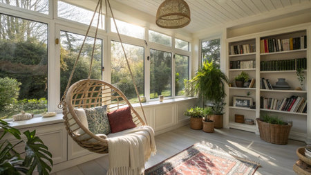 A sunroom with floor-to-ceiling windows, a hanging chair, and potted plants. Generative AI
