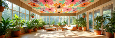 Sunlit conservatory with floral ceiling and abundant greenery in a cozy seating area. That the image is generated using AI.