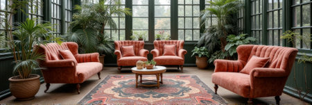 Elegant conservatory with velvet armchairs and indoor plants on ornate rug. That the image is generated using AI.