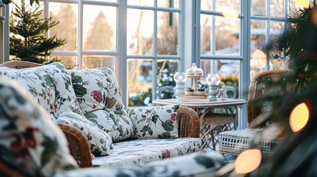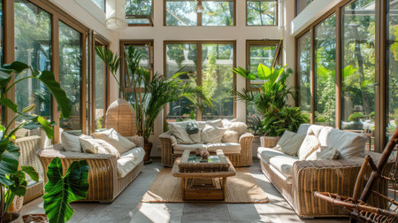 Serene sunlit conservatory with elegant wicker furniture and lush greenery. That the image is generated using AI.