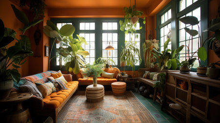 Botanical Bliss: A conservatory with floor-to-ceiling windows, overflowing planters, and a cozy seating area. Alvar Aalto style. Generative AI