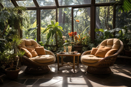 Elegant sunlit conservatory with wicker chairs and lush greenery. That the image is generated using AI.