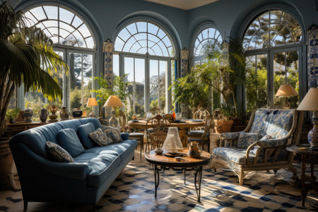 ornate sunroom in colonial revival style building, created with generative ai