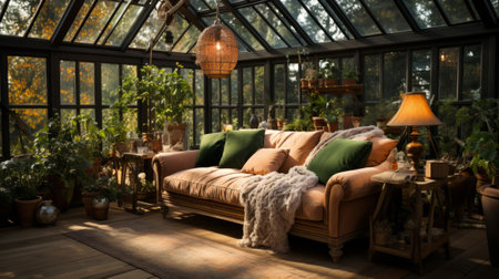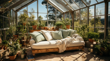 Cozy glasshouse with plants and sofa in garden in summer. Generative AI.